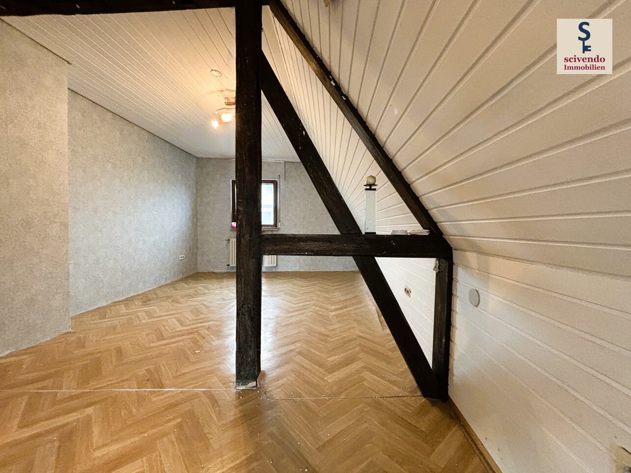 …könnte insbesondere im Obergeschoss umgebaut werden: Aktuell gibt es hier 2 Zimmer und ein Bad. Das Bad muss erneuert oder rückgebaut werden. Aus den 2 Zimmern könnte man 3 machen. Grundsätzlich sind das 2 – 3 attraktive Zimmer unterm Dach, sie müssten aber wieder schön gemacht werden.